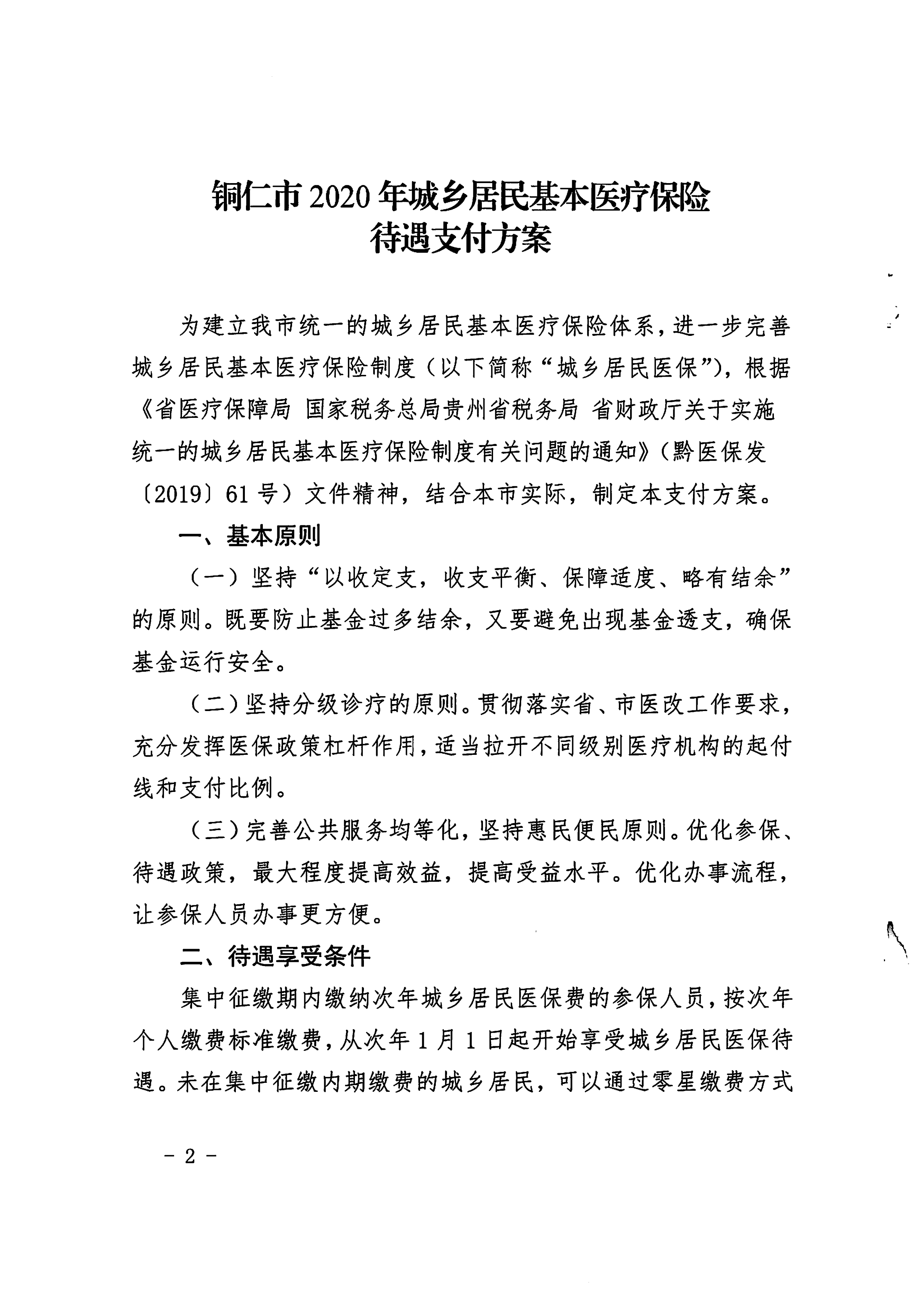 关于印发《铜仁市2020年城乡居民基本医疗保险待遇支付方案》的通知