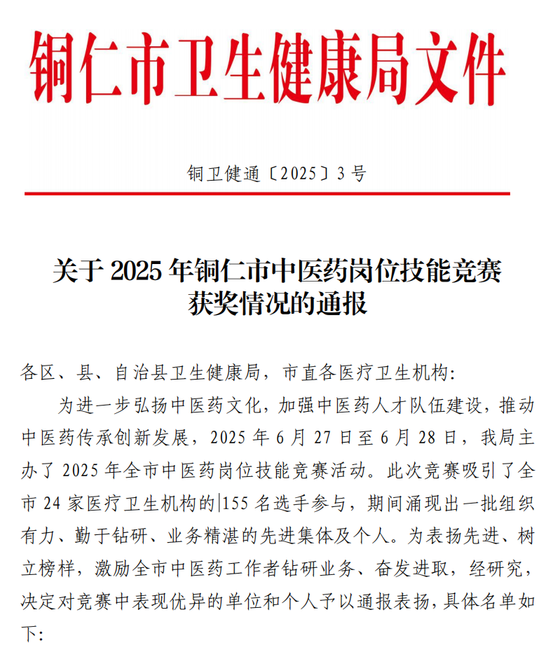 7月23日,铜仁市卫生健康局印发《关于2025年铜仁市中医药岗位技能竞赛获奖情况的通报》,在团体和个人单项共5个竞赛项目中,铜仁市中医医院除护理组外,囊括了其余4个一等奖。这是医院历年来参加全市中医药岗位技能竞赛获得的最好成绩。